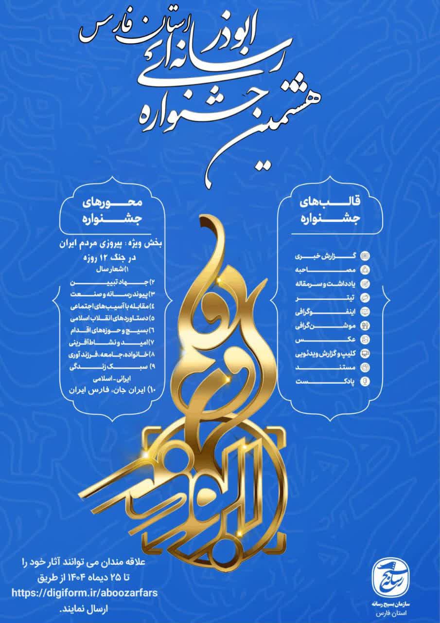 دبیر هشتمین دوره جشنواره رسانهای ابوذر فارس با اشاره به اینکه محور ویژه این جشنواره پیروزی مردم ایران در جنگ دوازده روزه است، تصریح کرد: آثاری قابلیت شرکت در جشنواره را دارد که در نشریات کشوری و استانی، خبرگزاریها و پایگاههای خبری منتشر شده باشد.